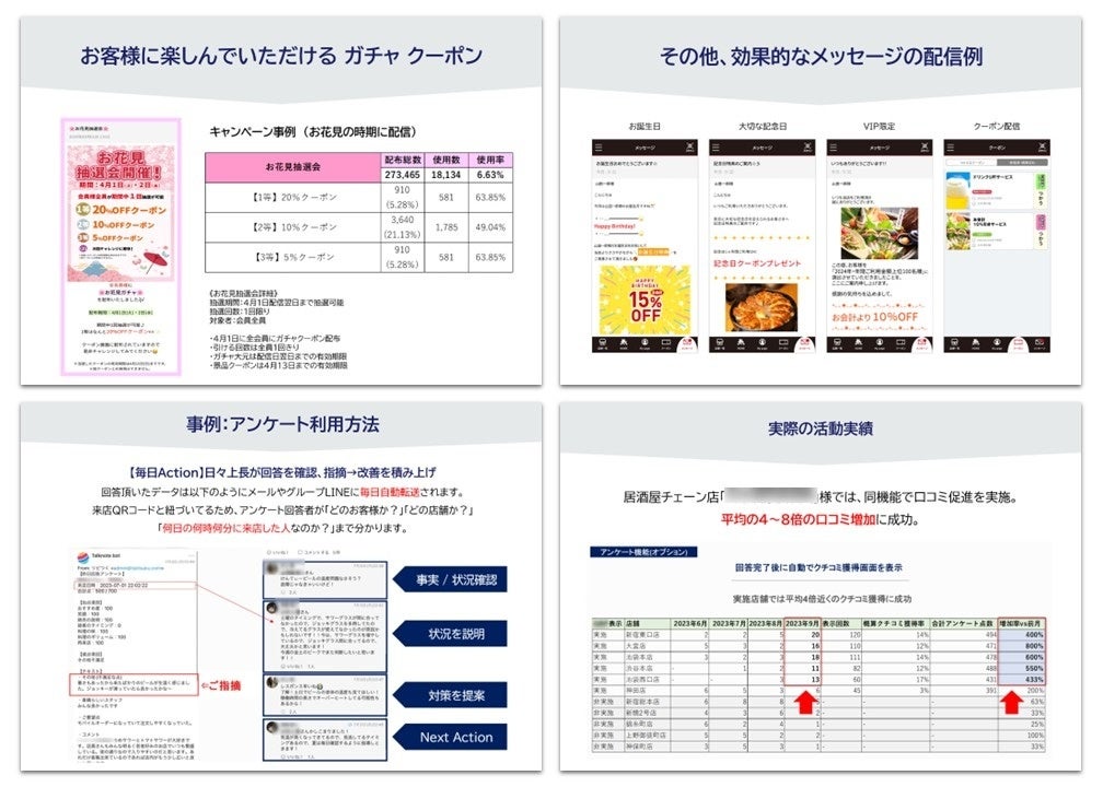 誕生日メッセージの平均来店率は4.02%、業態別で最大17%など、実データから導き出された“効果の出る販促テンプレート”を全店に活用可能。