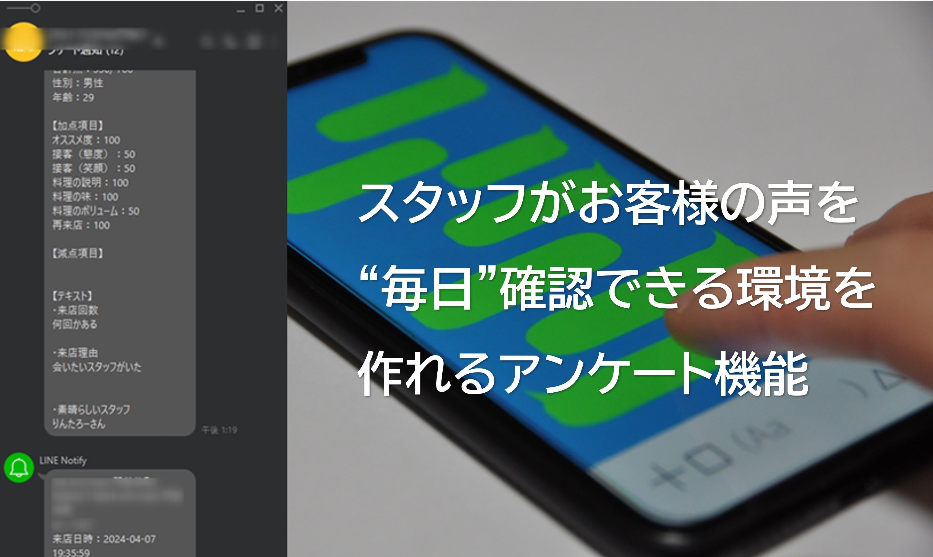 特に、アンケート機能は飲食店経営にフル活用することを目的とした独自の仕組みを多数持ちます。例えば、「アンケートを集めやすくする仕組み」や「集めたアンケートを定量化して分析する仕組み」、「現場スタッフに即シェアして改善やモチベーションUPに活かす仕組み」などがあります。