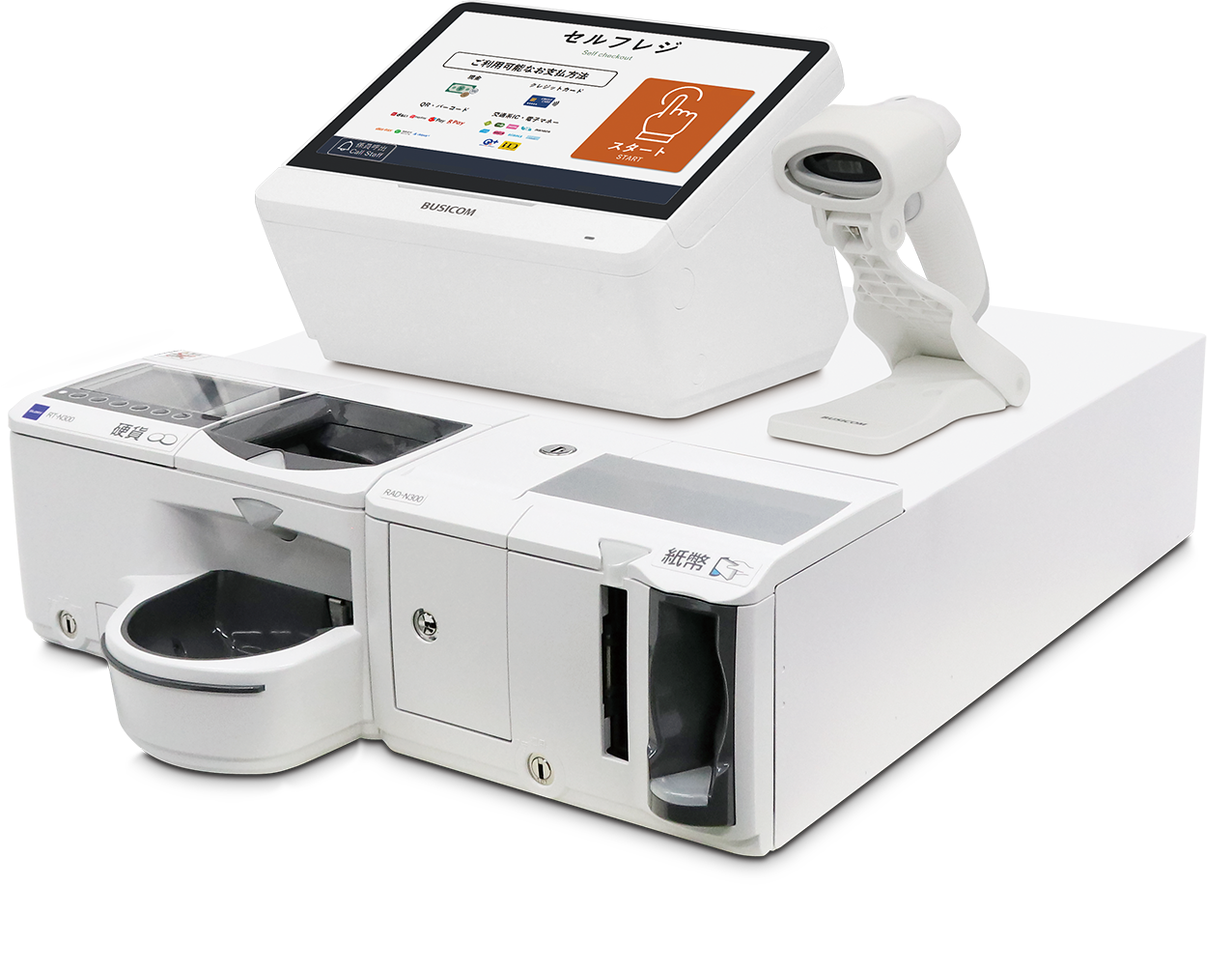 現金を扱わない完全キャッシュレスのフルセルフレジ運用に特化した構成です。自動釣銭機が不要なぶん設置スペースを抑えられ、コンパクトな筐体とシンプルなレイアウトでカウンター周りをすっきり保てます。限られたスペースでもスマートにフルセルフレジを導入したい店舗に最適です。
