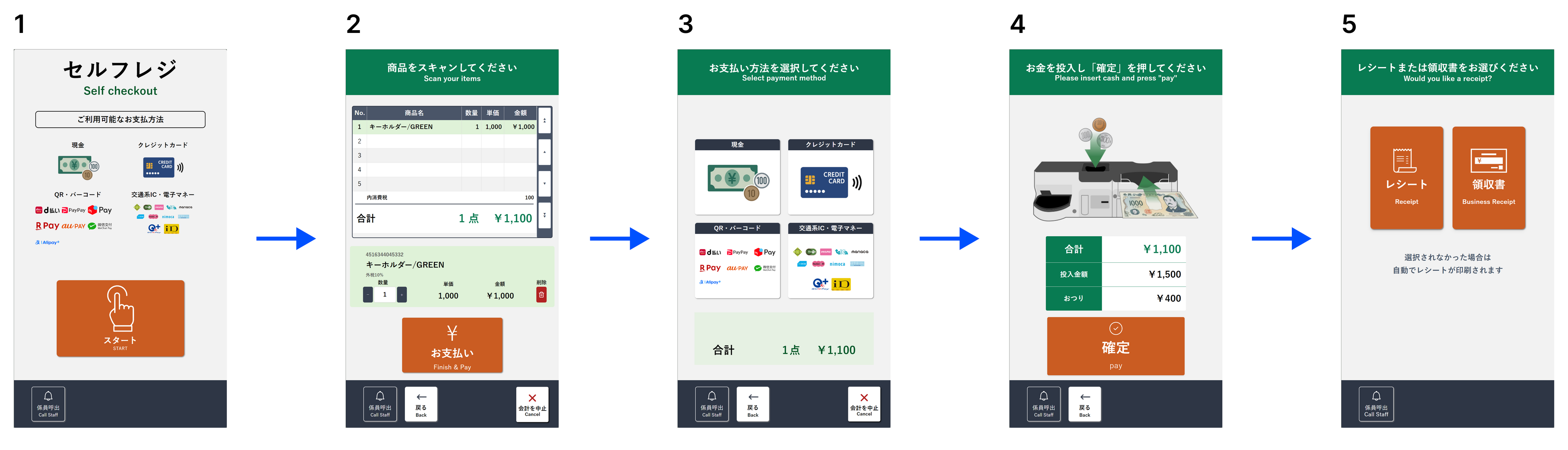 案内表示とボタン配置をシンプルに整理することで、どなたでも直感的に操作しやすい画面UIを実現しています。初めて利用されるお客様でも迷わずお会計いただけるよう設計されており、以下の流れでスムーズに精算が完了します。