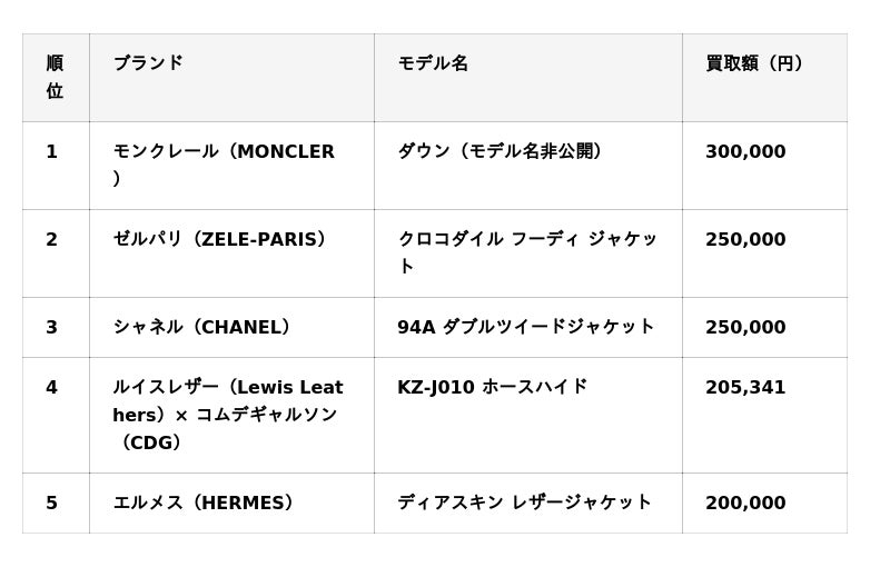 - アウター単品買取額ランキング(高額順 TOP5)