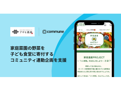相互交流で信頼を育む「Commune(コミューン)」を提供するコミューン株式会社は、株式会社アサヒ農園が運営する野菜好きが集まるコミュニティ「野菜遺産PROJECT ~「いい野菜」のはなしをしよう~」(以下、「野菜遺産PROJECT」)において、コミュニティユーザーが子ども食堂への寄付に気軽に参加できる新たな企画を実施することをお知らせします。