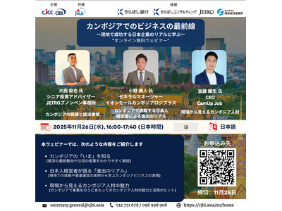 これまでCJCCとCJBIは、農業・ヘルスケアなど分野別に現地企業と日本企業を結ぶセミナーを開催してきました。今回は特定の分野に限定せず、実際に現地で活躍する日本人経営者の視点からカンボジアの“いま”をご紹介することで、日本企業が同国市場に関心を持つきっかけの一つとなることを目指しています。