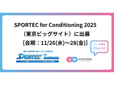スポーツテック企業のユーフォリア(本社:東京都千代田区、代表取締役:橋口 寛/宮田 誠、以下 ユーフォリア)は、2025年11月26日(水)から28日(金)の3日間、東京ビッグサイトで開催される日本最大級の展示会「SPORTEC for Conditioning 2025」に出展することをお知らせいたします。ブース【E5-8-10】に、ぜひお立ち寄りください。
