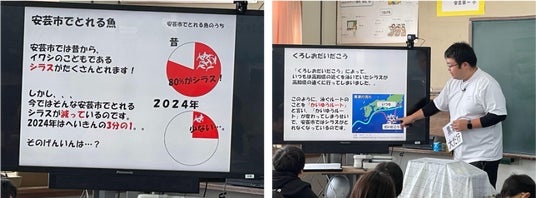 授業では、実際に大学で養殖されているブリの稚魚「モジャコ」を教室に持ち込み、子どもたちに公開。活きた魚を間近で観察することで、研究者が行う「育てる漁業」の技術と、持続可能な食糧確保の重要性を学びました。
