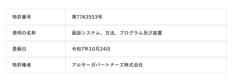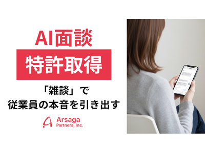 企業のDXを促進するアルサーガパートナーズ株式会社(本社:東京都渋谷区、代表取締役会長兼CTO:小俣泰明、代表取締役CEO:渡邉純平、以下「アルサーガパートナーズ」)は、AI面談における「雑談によるラポール形成技術*」に関する特許を取得したことを発表いたします(特許番号:7763553)。