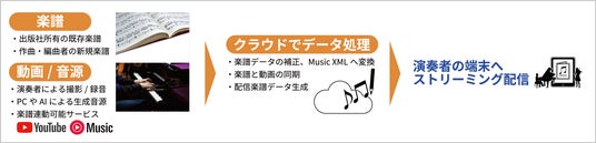 出版社が保有する既存楽譜や作曲・編曲者の新規作品、演奏者の録音・動画データ、AI生成音源、さらにはYouTubeなどの公開動画をクラウドにアップロードすると、クラウド上で自動的にMusicXML形式へ変換・補正し、動画や音源と同期した配信用データを生成します。