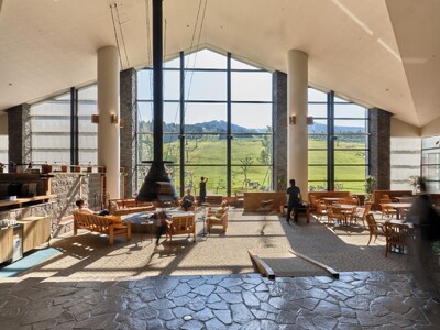 グリーンシーズンは緑豊かなアクティビティフィールド、スノーシーズンは白銀のゲレンデが目の前に広がるホテルロビー