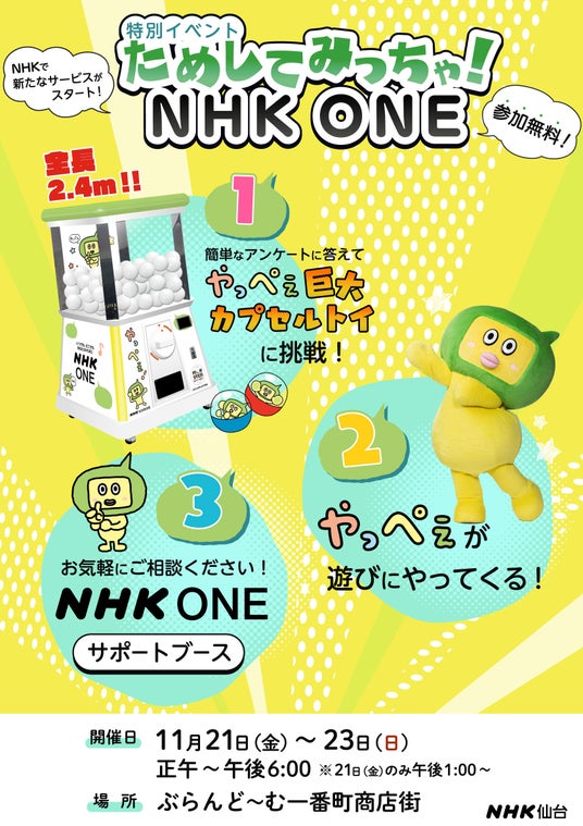 NHK仙台放送局が開催するイベント「“いつでも どこでも あなたのそばに” ためしてみっちゃ!NHK ONE」において、株式会社グリーグローブが企画・運営を行う、高さ2.4mの巨大ガチャ「モンスターカプセル」が登場します。本イベントは、仙台市中心部のアーケード商店街「ぶらんど~む一番町」にて、2025年11月21日(金)から23日(日)までの3日間開催されます。