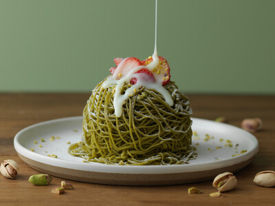 賞味期限10分の出来立てモンブラン「ふわほろモンブラン」より、今年もピスタチオの味を販売いたします。イタリア産ピスタチオと和栗を掛け合わせた、コク深い味わいのマロンクリームを絞りたてでお楽しみいただけます。ジャージーミルクアイスとミルキーでコクのあるオリジナル生クリームを、 1mmの口金から絞り出される極細モンブランクリームで優しく包み込みました。ナッツの女王といわれるピスタチオの香ばしく濃厚な味わいに、お好みでジャージーミルクソースをかけてお楽しみください。