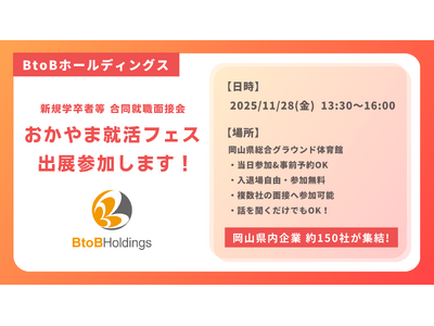中国地方エリアを中心にWEB・OAソリューションをはじめとしたBtoB総合サービス業を展開する株式会社BtoBホールディングス(所在地:岡山県岡山市、代表取締役:仁科 慎太郎)は、2025年11月28日(金)に開催される、「おかやま就活フェス(新規学卒者等 合同就職面接会)」に出展参加します。