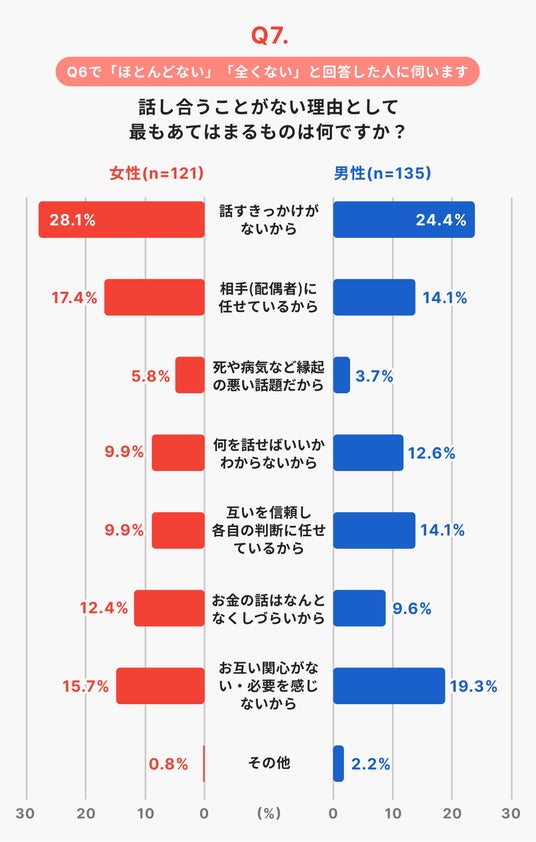 - 保険について話し合わない男女が過半数(52.6%)。理由は「タブー」視(男性3.7%、女性5.8%)ではなく、「きっかけがない」(男性24.4%、女性28.1%)。