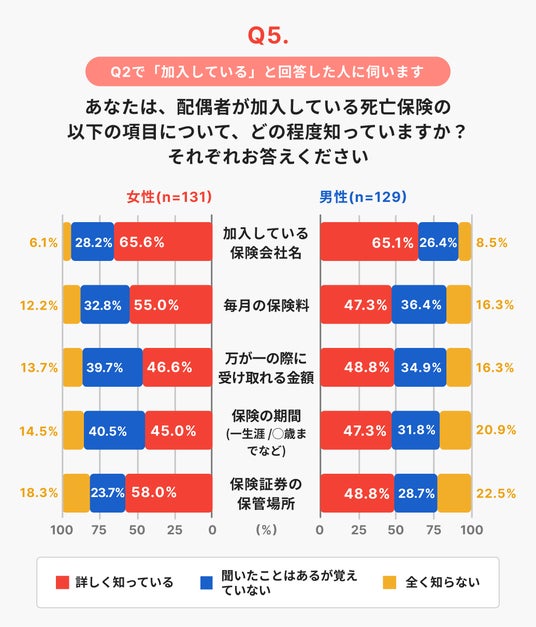 しかし、配偶者が加入している死亡保険についてどの程度知っているか聞いたところ、夫の「保険証券の保管場所」を『詳しく知っている』と回答した女性は58.0%にとどまりました。42.0%(『聞いたことはあるが覚えていない』23.7%+『全く知らない』18.3%)の女性が、夫が万が一の際に必要な保険証券の場所を正確に把握していないことになります。