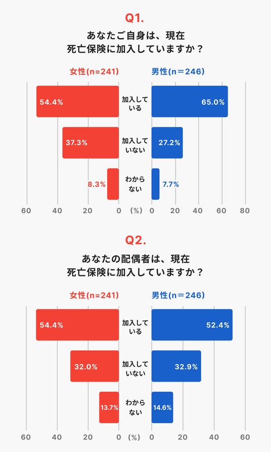 - 配偶者の死亡保険の加入状況が「わからない」男女ともに約14%。実際に加入しているのに配偶者が知らない「サイレント保険」が発生している可能性。