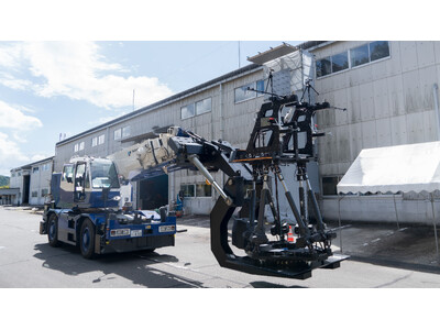 ハイウェイテクノフェア 2025 に続く 2 度目の公開ですが、現場での実用を見据えたロボットシステム全体として、揚重機械(ラフテレーンクレーン)に取り付けた状態での初公開となります。