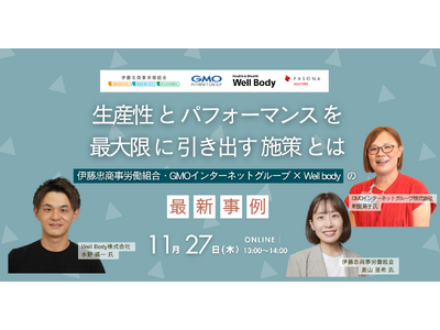株式会社パソナ(本社:東京都千代田区、代表取締役社長 中尾慎太郎)は人材育成/開発・人事企画・経営企画のご担当者様へ向けたウェビナー、「生産性とパフォーマンスを最大限に引き出す施策とは-伊藤忠商事労働組合・GMOインターネットグループ×Well bodyの最新事例-」を11月27日(木)に開催いたします。