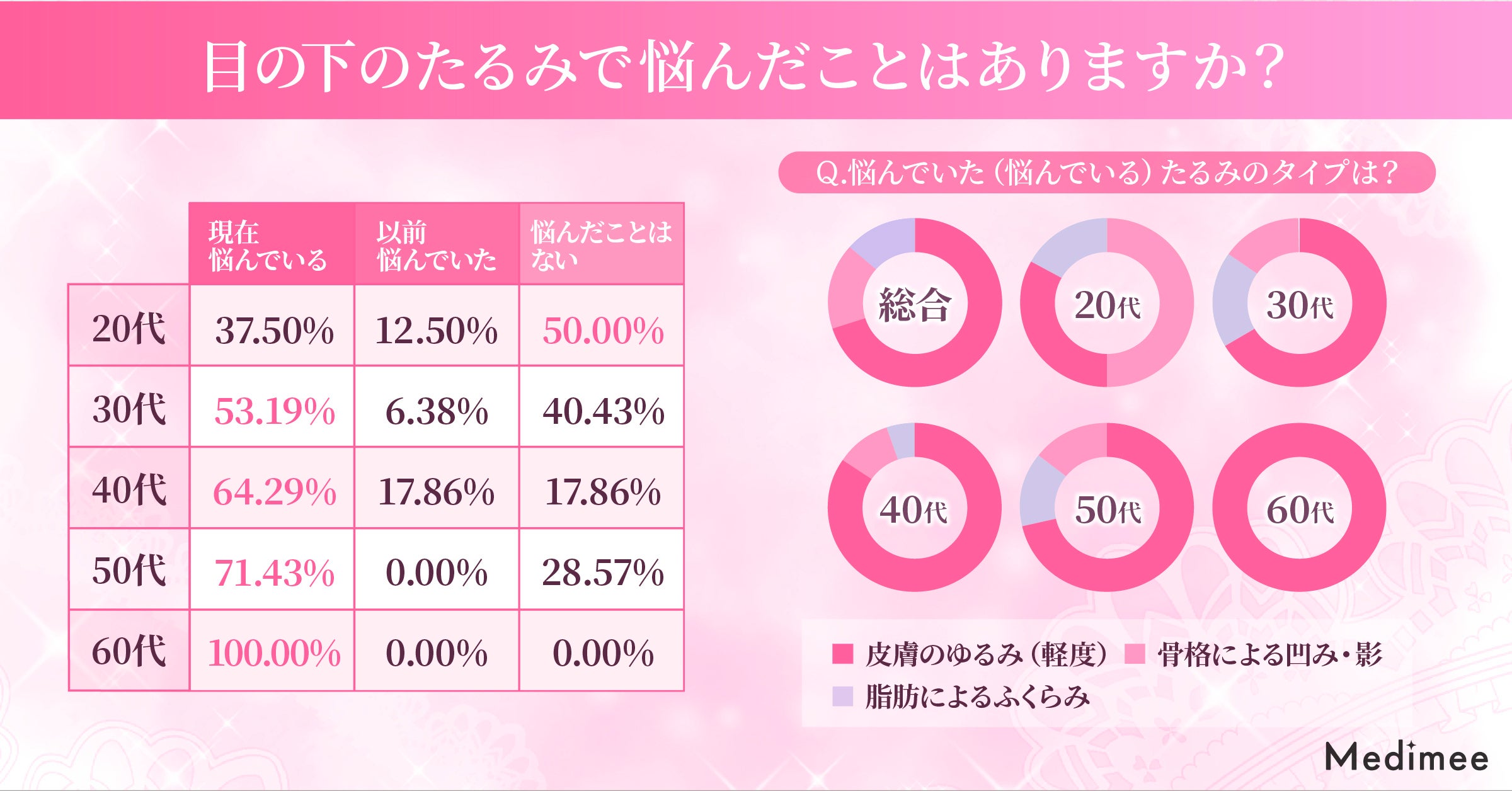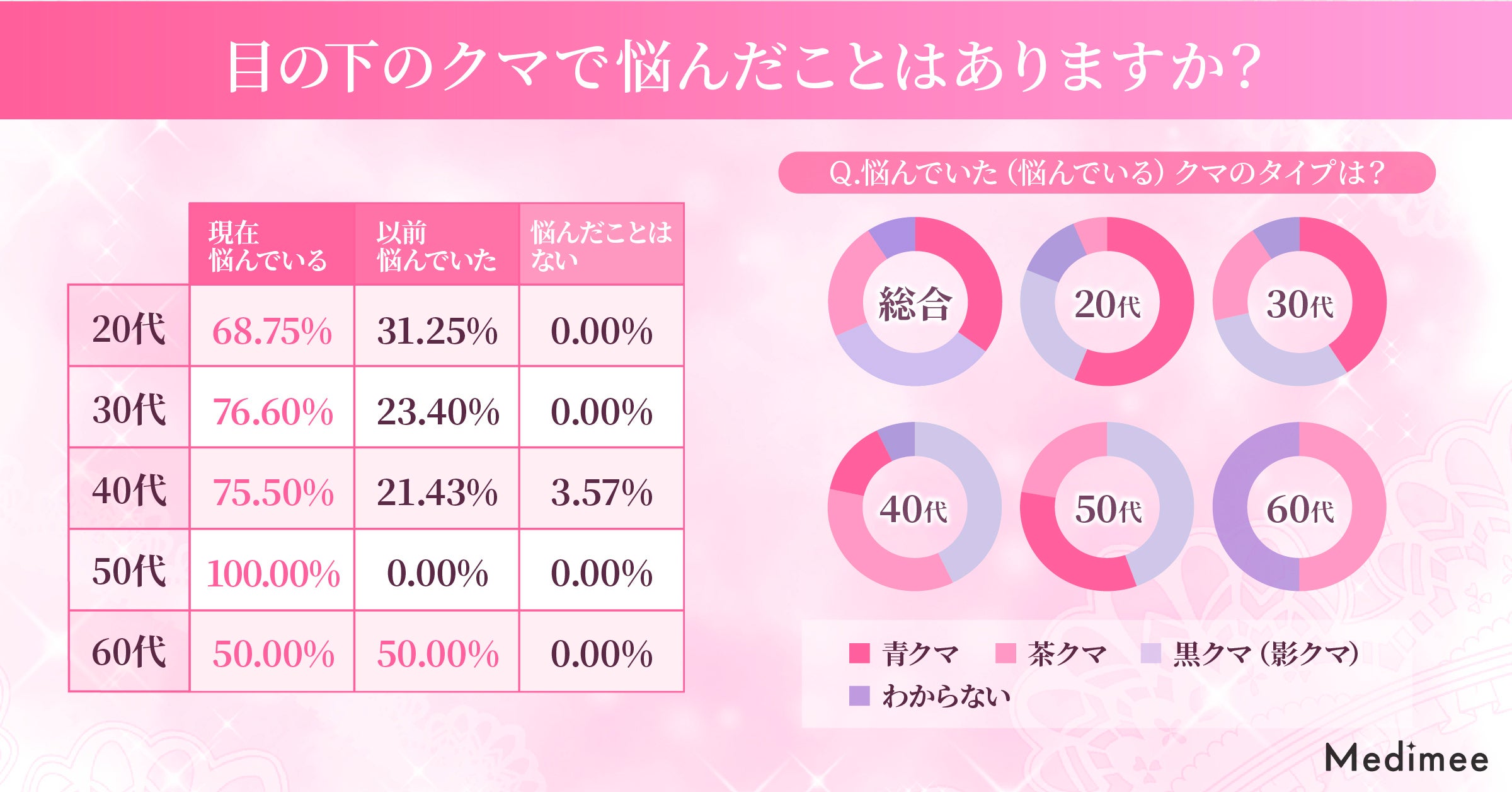 今回の調査では、年代を問わず多くの方が目の下のクマ・たるみに悩みを抱えていることが明らかになりました。