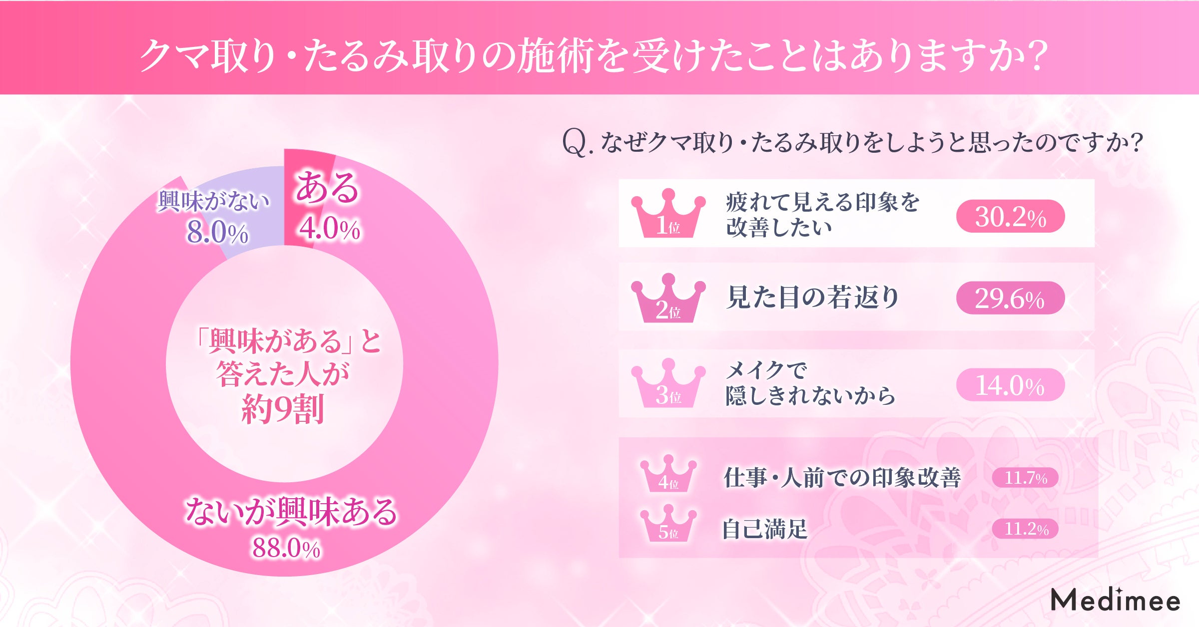 クマ取り・たるみ取りの施術を実際に受けたことがある人は全体のわずか4%にとどまった一方で、「受けたことはないが興味がある」と回答した人は88%にものぼりました。