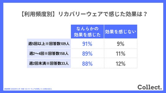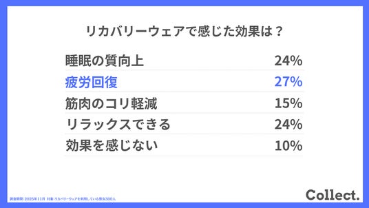 近年、就寝中や日常のリラックスタイムに着用する「リカバリーウェア」が注目を集めています。そこでCollect.(コレクト)では、リカバリーウェア利用者300人を対象に、「本当に効果があるのか」「どの年代・どんなシーンでどのような効果が実感されているのか」を調査しました。