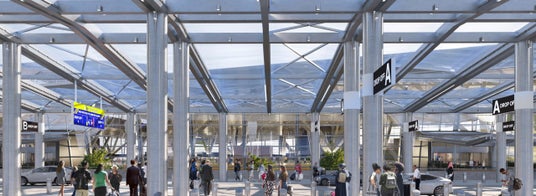 Birdair Inc.が設計、製造、施工を受注した膜屋根はターミナルのエントランス上に設置されます。LEDを用いた照明演出との相性を考慮し、白色のETFEフィルム屋根が採用されました。約27,800平米の屋根は291個のパネルで構成されます。新ターミナルの第1工区が完成する2026年6月に向けて、現在工事が進行中です。ターミナル全体の完成は2030年を予定しています。