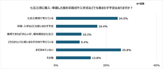 「七五三用に購入・準備した服を卒園式や入学式などでも着回す予定はありますか?」という設問に対し、「七五三専用で考えている」と答えた人が24.5%で最多となった一方で、「卒園・入学などにも使い回す予定(16.4%)」、「兼用できればうれしいが、優先順位は七五三(10.1%)」、「どちらかというと使いまわす方向で考えている(9.4%)」と、着回しを検討している人は合計で35%以上となりました。