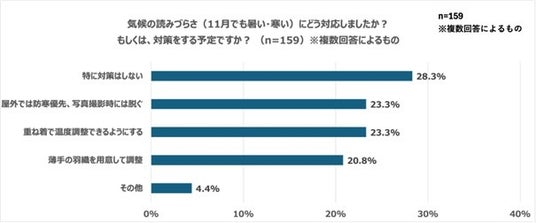 2025年は、「二季」というワードも流行語大賞にノミネート入りしましたが、「気候の読みづらさ(11月でも暑い・寒い)にどう対応しましたか?もしくは、対策をする予定ですか?」との設問に対しては、「屋外では防寒優先、写真撮影時には脱ぐ(23.3%)」、「重ね着で温度調節できるようにする(23.3%)」、「薄手の羽織を用意して調整(20.8%)」と、重ね着などで調整する人がほとんどで、「特に対策はしない」と回答した人は28.3%となり、調整も不要なシーズンレスアイテムへの需要も伺える結果となりました。