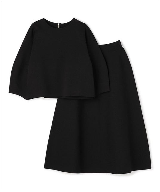 ボリュームスリーブのトップスと、ニットスカートのセットアップ。どちらのカラーもセットならフォーマルなシーンでもきちんと感を演出できます。ハリ感のある素材でスカートの美しいフォルムが特長なので、ショートブーツでモードに、パンプスでエレガントにと、シーンごとにシューズを合わせると、より全体のシルエットが引き立ちます。