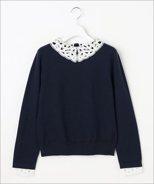 取り外し可能なレースが、顔まわりや手元に華やかなニュアンスを添える一枚。シーンに合わせて表情をチェンジできるので、華やかに装いたい日はレースを効かせて、シンプルにまとめたい日はニットのみで、などオンでもオフでも活躍するまさに“二面性”を楽しめる万能ニット。