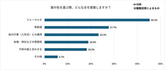 七五三イベントにおいて、「服の色を選ぶ際、どんな点を意識しますか?」の設問に対して、「フォーマルさ」と回答した人は45.3%で一番多い結果となりました。