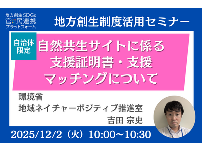 企業版ふるさと納税を活用した地域課題解決プラットフォーム「river(リバー)」を運営する株式会社カルティブ(本社:神奈川県横浜市、代表取締役:池田 清)は各省庁の出している補助金・交付金の活用方法を自治体様向けに伝える「地方創生制度活用シリーズセミナー」として、2025年12月2日(火)に環境省担当者による自治体限定オンラインセミナー「自然共生サイトに係る支援証明書・支援マッチングについて~ネイチャーポジティブに貢献する取組を国が認証します~」を開催します。