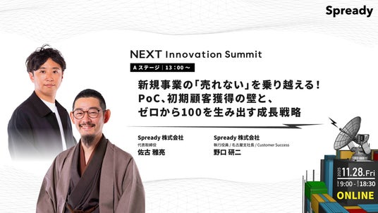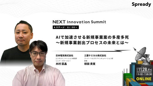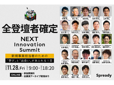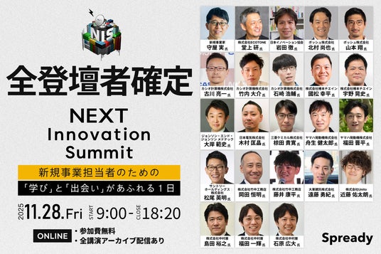 新規事業支援サービスを提供するSpready株式会社(本社:東京都渋谷区、代表取締役社長:佐古雅亮、以下「当社」)は、2025年11月28日(金)に新規事業の取り組みや知見を発信するカンファレンス「NEXT Innovation Summit 2025 in Winter 新規事業担当者のための『学び』と『出会い』があふれる1日(以下「本イベント」)」の全登壇者が確定したことをお知らせします。