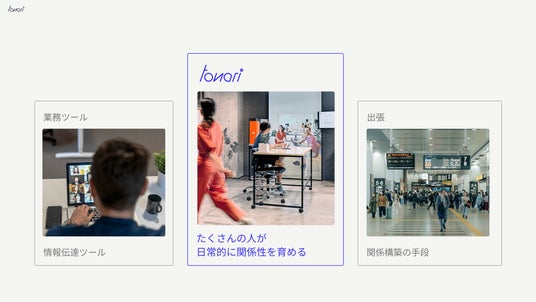 等身大のスクリーンを介して2つの空間をつなぐコミュニケーションツール tonari を開発する2018年創業のスタートアップ企業。2020年に法人向けの販売を開始して以来、JR東日本やNTT西日本、ハーバード大学、介護施設など、欧米や東南アジアを含む国内外のさまざまな施設に導入されています。tonariは他拠点間のシームレスなコミュニケーションを可能にし、物理的な距離による境界のない世界を目指し、新しい働き方による事業創出に貢献します。