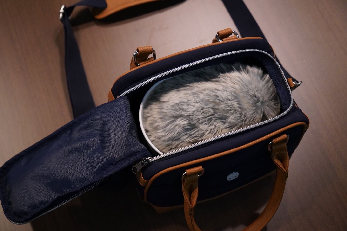 “Moflin“をコンパクトに持ち運べる専用バッグです。肩掛けと手持ちの2WAY仕様で、長時間の移動でも肩の負担が少ないバンドデザインを採用しました。開口部は両側開閉式で、いつでも“Moflin”の様子を確認しやすい仕様に。”Moflin”の本体だけでなく、ハウスとACアダプターも収納できるサイズです。