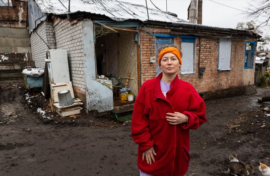 空爆で損壊した建物の前に立つナタリアさん(45歳)。「ミサイルが落ちた時、私たちは皆寝ていました。毛布にくるまっていたから助かったようなものです」。爆音とともに天井が崩れ、家の中は粉じんで何も見えず、家族の無事を確認するまで数分を要したといいます。「とても寒いのに、攻撃でガスが止まりました。冬を暖かく過ごすのは本当に難しい状況です」。(C) UNHCR/Andrew Prior