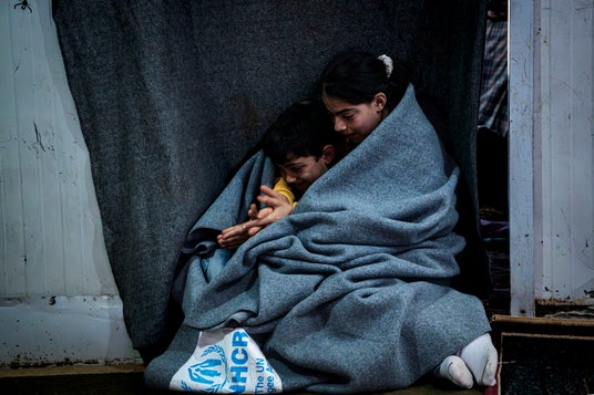 ヨルダンのザータリ難民キャンプで、UNHCRの毛布に包まれて寄り添うスンドゥスさん(11歳)と弟のヒシャムさん(6歳)。足に障害があるスンドゥスさんは歯科医を夢見て泥道を歩いて通学し、正義感の強いヒシャムさんは警察官を志しています。凍える冬の間、子どもたちは小さなシェルターの中で希望をつなぎます。(C) UNHCR/Shawkat Alharfoush