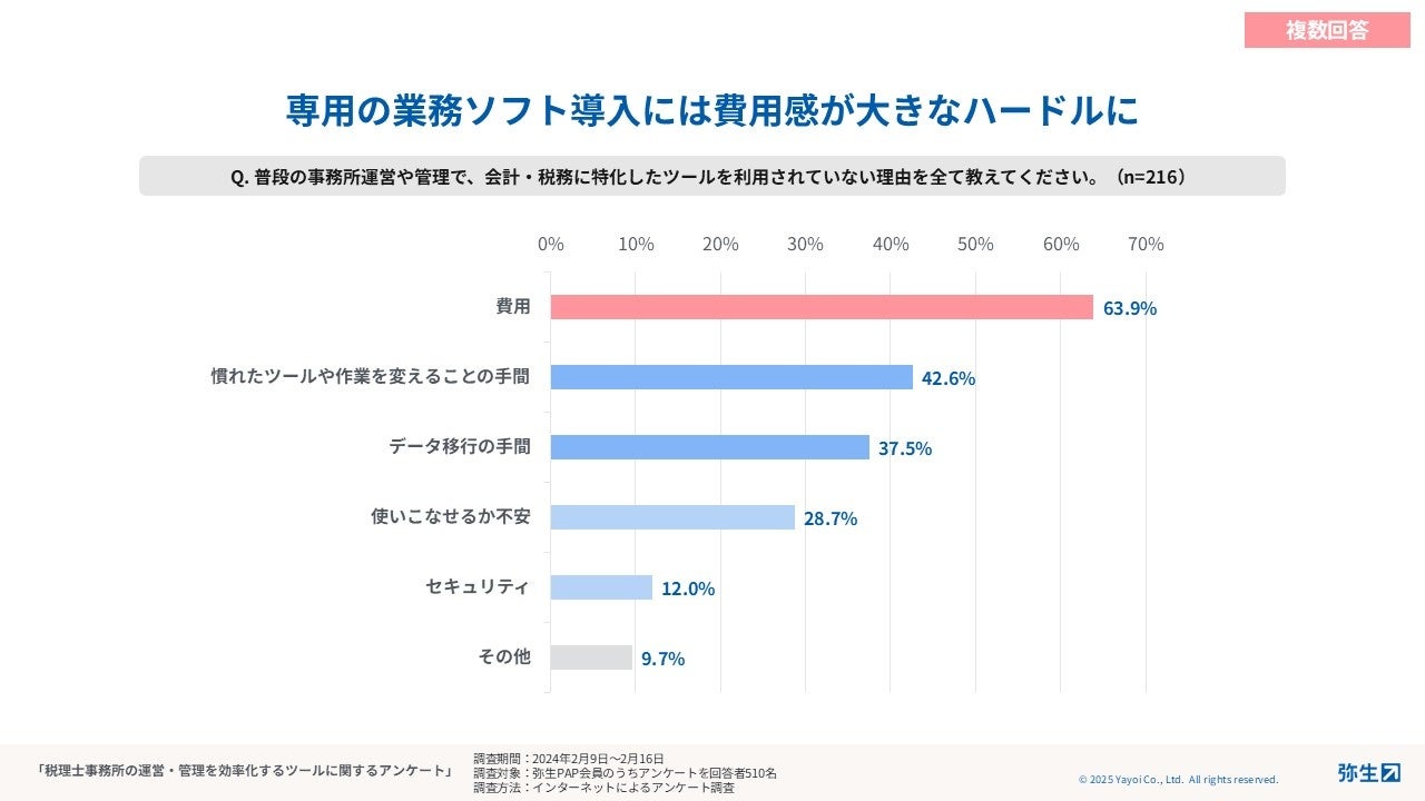 弥生の調査によると、約85%の会計事務所が、日々の事務所運営・管理の業務効率化を必要と感じています。一方で、実際に事務所運営・管理のための業務システムを導入している事務所は約30%に留まっています。また、業務システムの導入をしない理由としては、63.9%が「費用」、42.6%が「慣れたツールや作業を変えることの手間」を選択していました。