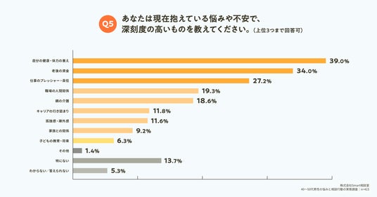 「Q5.あなたが現在抱えている悩みや不安で、深刻度の高いものを教えてください。(上位3つまで回答可)」(n=415)と質問したところ、「自分の健康・体力の衰え」が39.0%、「老後の資金」が34.0%、「仕事のプレッシャー・責任」が27.2%という回答となりました。40代~50代の男性は、仕事面・プライベート面ともに人生の転換期にあたり、悩みが多い世代です。キャリアやお金、健康、介護など、幅広い悩みに対応できる体制の整備が求められます。