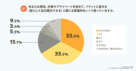「Q1.あなたは現在、仕事やプライベートを含めて、フラットに話せる(安心して自己開示できる)と感じる居場所をいくつ持っていますか。」(n=415)と質問したところ、「どこにもない」が33.0%、「1つ」が33.2%という回答となり、全体の6割以上にのぼりました。この結果から、相談先の不足や心理的安全性のある居場所の希薄さが浮き彫りになっています。