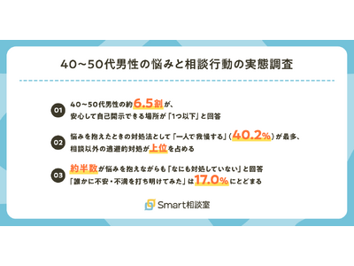 株式会社Smart相談室(本社:東京都港区、代表取締役・CEO:藤田 康男、以下:「当社」)は、40~50代の社会人男性415名を対象に、40~50代男性の悩みと相談行動の実態調査を実施しましたので、お知らせいたします。