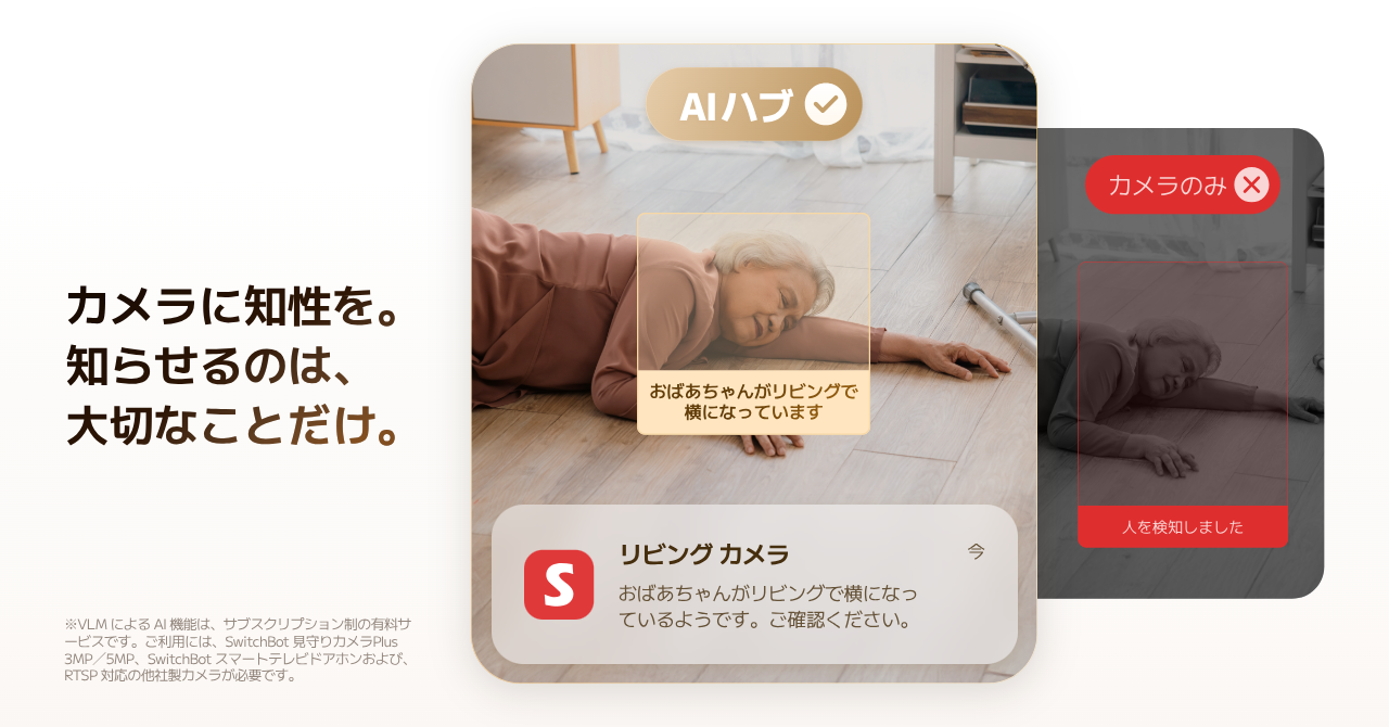 ※VLMによるAI機能は、サブスクリプション制の有料サービスです。ご利用には、SwitchBot 見守りカメラPlus 3MP/5MP、SwitchBot スマートテレビドアホンおよび、RTSP対応の他社製カメラが必要です。