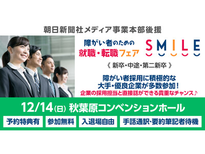 今回は12月14日(日)東京・秋葉原駅からすぐ、アクセスのよい秋葉原コンベンションホールにて開催。首都圏中心に就労を志向する方との企業との出会いを創出いたします。本企画はWEB告知に加えて、社会的に大きな影響力をもつ朝日新聞でも告知を展開。WEB、SNSなどメディアミックスにより情報を拡散。各種学校や就労支援機関等にもチラシ・ポスターを掲示し、多方面から就職、転職希望層にアプローチして来場を促進します。朝日新聞グループ企業として、多様な人材が活躍する社会の発展に貢献していけますよう、本企画は今後も継続して開催してまいります。