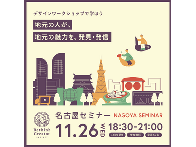 プロフェッショナル人財の育成を通じて、クリエイターに新たな働き方を提案する株式会社クリエイターズマッチ(本社:東京都港区、代表取締役:呉京樹、以下、「クリエイターズマッチ」)は、主催する『Rethink Creator PROJECT』を、JTが取り組む地域社会への貢献活動である「Rethink PROJECT」の協賛のもと実施いたします。本取り組みの趣旨に賛同いただいた、名駅南地区まちづくり協議会の共催、および名古屋市の後援のもと、デザインや地域の情報発信に興味がある方向けの地域セミナーを愛知県名古屋市で開催します。