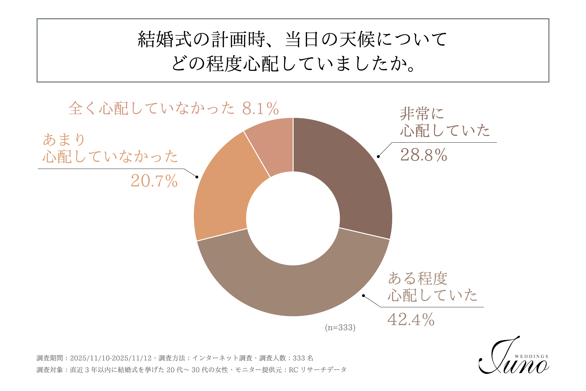 直近3年以内に結婚式を挙げた20代~30代の女性の7割以上が、程度の差こそあれ当日の天候を心配していた