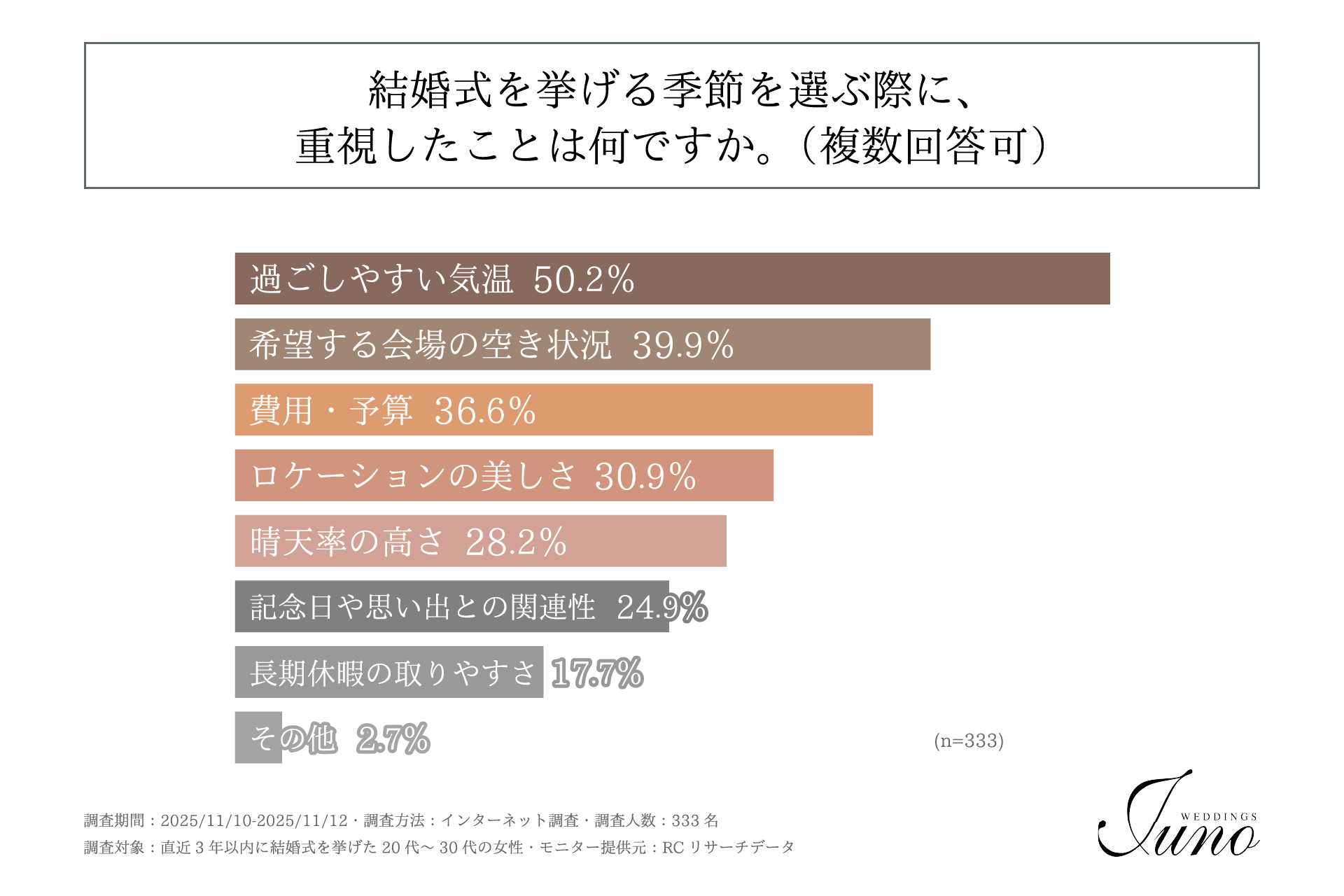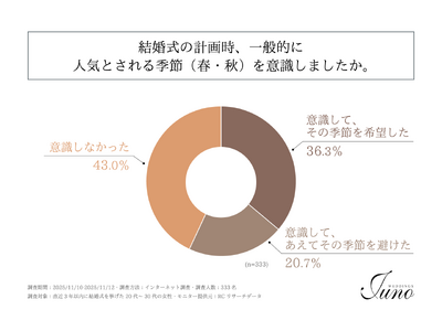 近年、結婚式の会場選びにおいて、天候リスクを回避できる屋内会場や全天候型式場の需要が増加し、従来の人気の季節に偏りが見られていた結婚式のスタイルに変化が生じている可能性があります。この変化は、結婚式を挙げたい季節に対する人々の意識、特に伝統的な人気シーズン(春・秋)への意識にも影響を与えていると考えられます。そこで、「ウェディングドレスショップJUNO」は、直近3年以内に結婚式を挙げた20代~30代の女性を対象に「結婚式を挙げたい季節に関する調査」を実施しました。