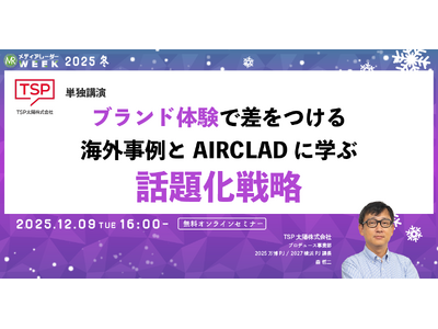TSP太陽株式会社(本社:東京都目黒区、代表取締役社長:池澤 嘉悟)は、広告業界のプラットフォーム「メディアレーダー」が主催するオンラインセミナーイベント「第20回メディアレーダーWEEK 2025 冬」に登壇いたします。本セミナーでは、「ブランド体験で差をつける 海外事例とAIRCLADに学ぶ話題化戦略」をタイトルに、『ブランド体験を建築する、新しい建築ブランディング思想』をテーマとして、リアルイベントの価値再定義について解説します。