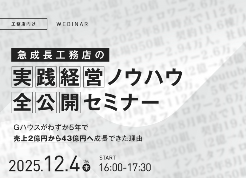 株式会社Gハウス(本社:大阪府大阪市旭区、代表取締役社長:趙晃啓)は、住宅業界のコンサルティングを行う株式会社SUMUS(スムーズ)との共催による特別オンラインセミナーを2025年12月4日(木)に開催いたします。本セミナーでは、著しい成長を遂げてきたGハウスの経営ノウハウを公開し、厳しい市場環境下を勝ち抜くための経営戦略・施策についても具体的に解説いたします。