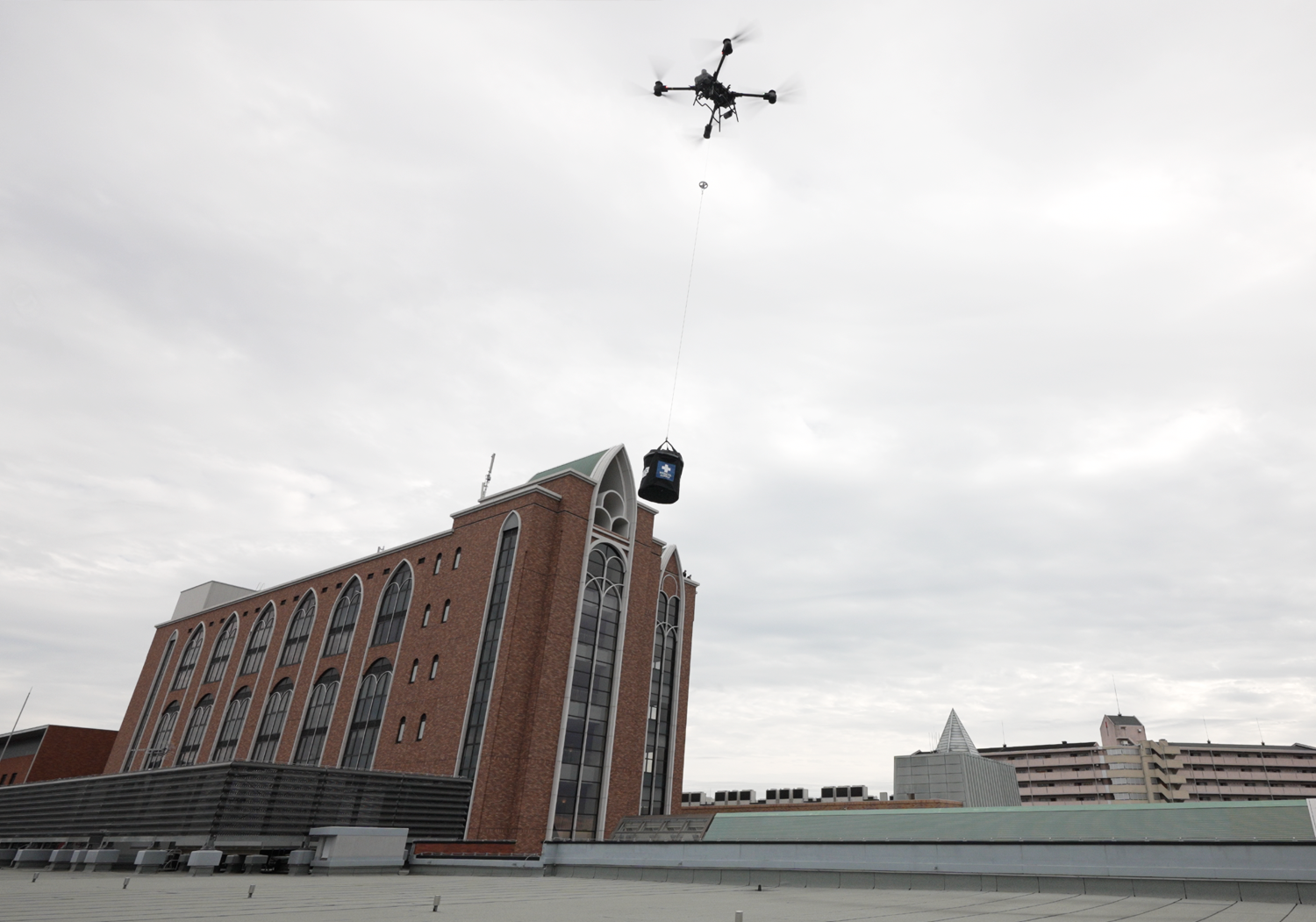 医療資材(ガーゼ、輸血セット等)13.6kg(ワイヤー等の吊り具を除く)を実際に輸送し、離陸~荷下ろしまでの一連の流れを検証。
