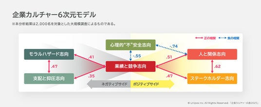 モデルは、1.人と関係志向、2.ステークホルダー志向、3.業績と競争志向、4.支配と抑圧志向、5.心理的“不”安全志向、6.モラルハザード志向の6つの要素で構成。中核となる「業績と競争志向」を中心に、ポジティブ(人と関係・ステークホルダー)とネガティブ(支配・モラルハザード)の両面構造が前年と同様に確認されました。