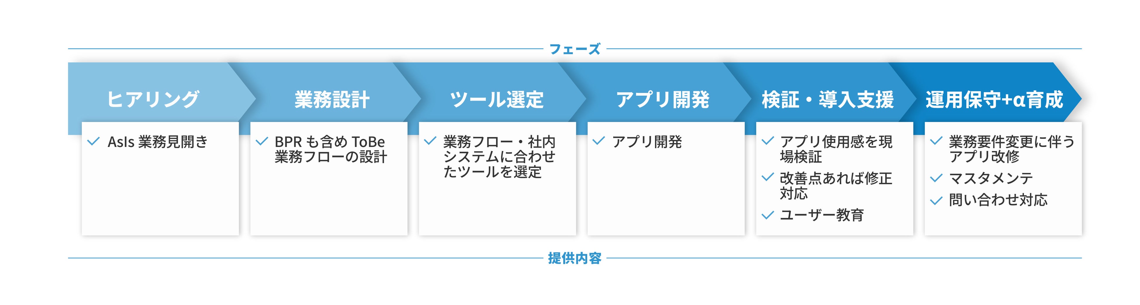 一気通貫型の提供:業務設計(BPR)を起点に設計~実装~運用まで一貫伴走。作って終わりにしない定着支援を実施。