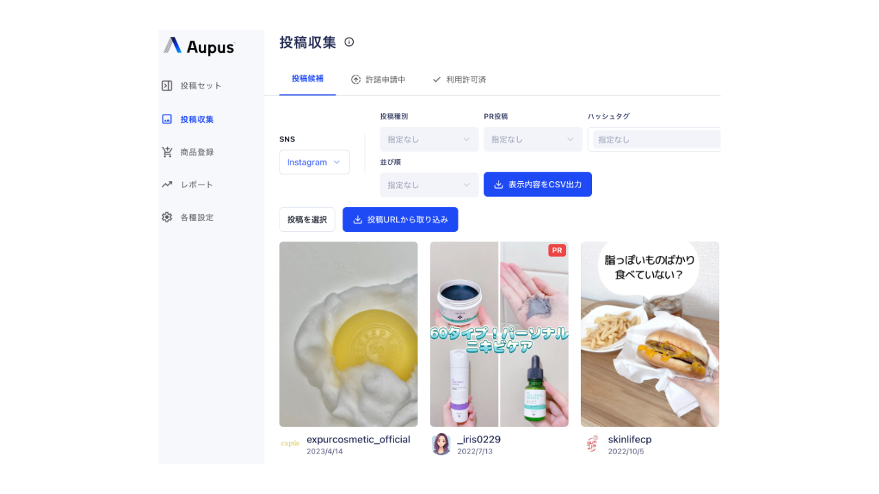 “売れるUGC”を発見するAupusSNS上のハッシュタグ・トレンド分析を通じてUGC(ユーザー投稿)を抽出し、「どのコンテンツが売上に繋がるか」「どの投稿が購買意欲を刺激するか」を可視化します。